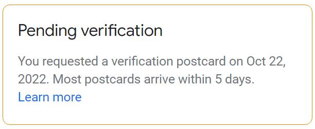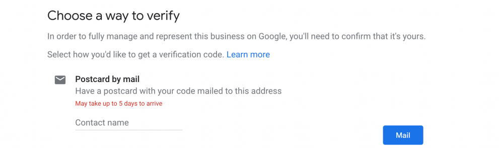 Once the verify button has been clicked, you’ll see the verification methods that are available for your business. In this example, we see the postcard verification option…
